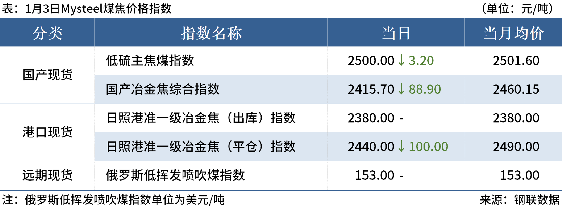◎1月3日,河北、山東主流鋼廠提降焦炭首輪,濕熄焦100元/噸,干熄焦110元/噸,目前基本全面落地執(zhí)行。