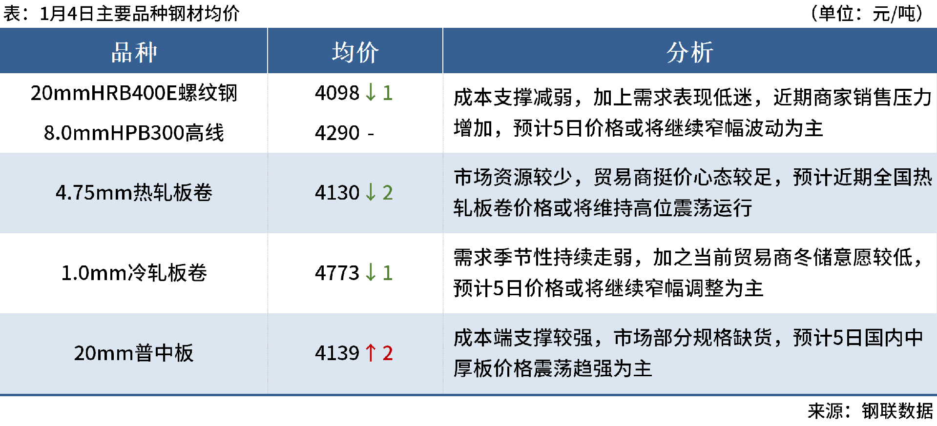 ◎1月4日,全國主港鐵礦石成交112.70萬噸,環(huán)比增26.2%;237家主流貿(mào)易商建筑鋼材成交12.48萬噸,環(huán)比減7.4%。