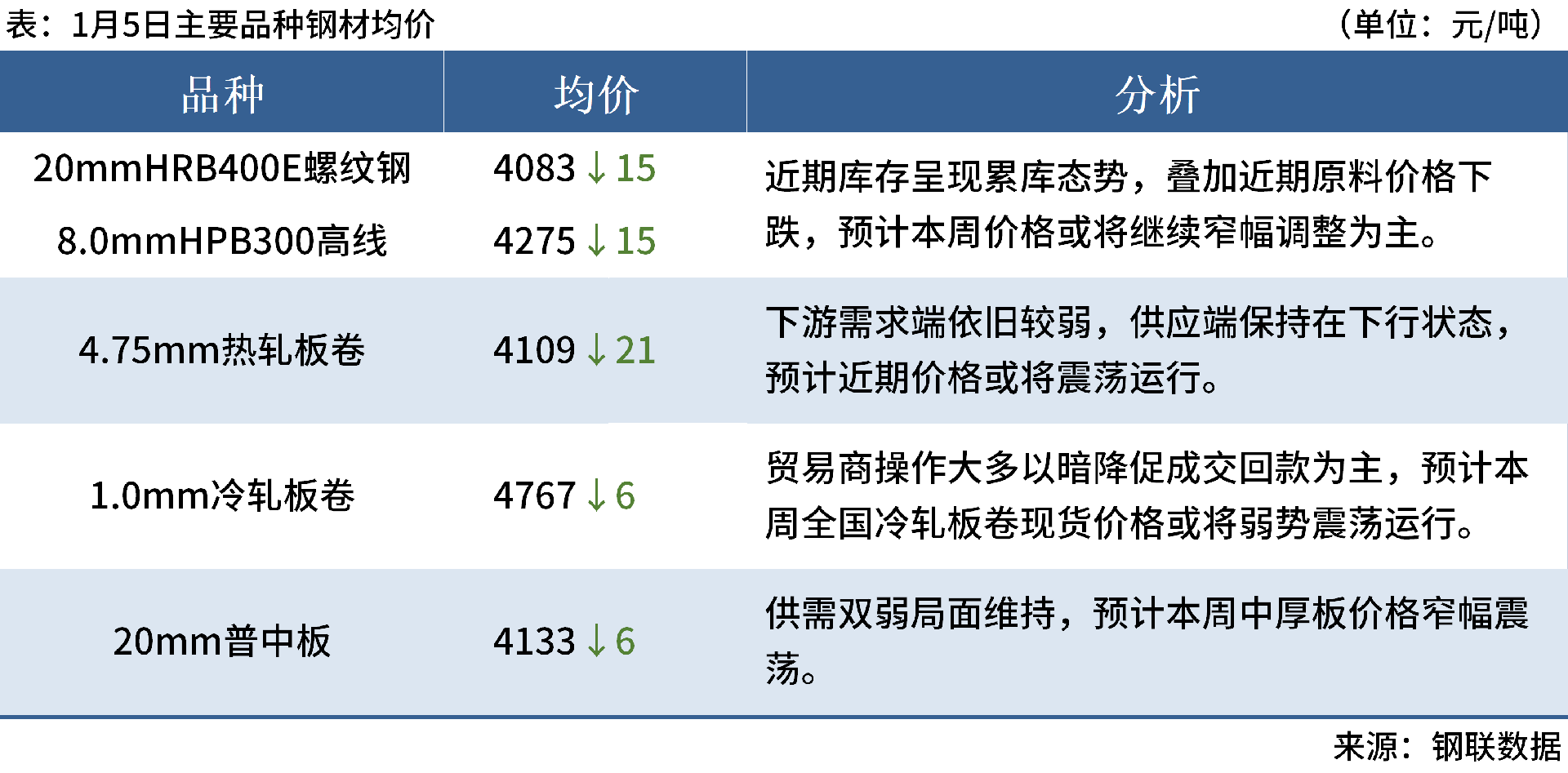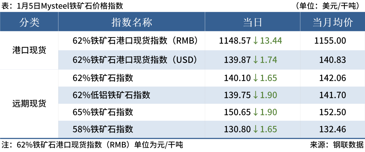 ◎ 1月5日,全國主港鐵礦石成交93.60萬噸,環(huán)比減16.9%;237家主流貿(mào)易商建筑鋼材成交11.92萬噸,環(huán)比減4.5%。