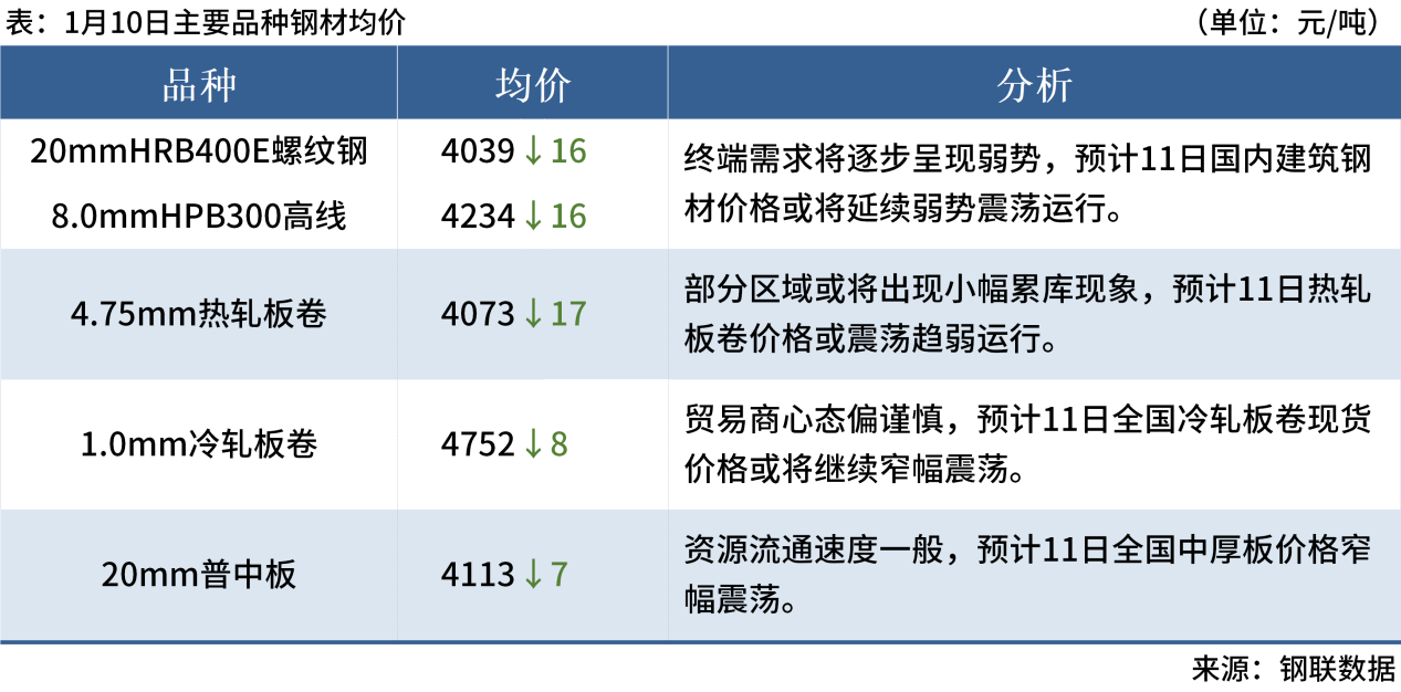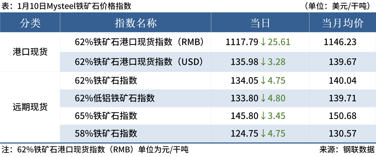 ◎ 1月10日,全國主港鐵礦石成交83.00萬噸,環(huán)比減27.1%;237家主流貿(mào)易商建筑鋼材成交10.64萬噸,環(huán)比減16.9%。