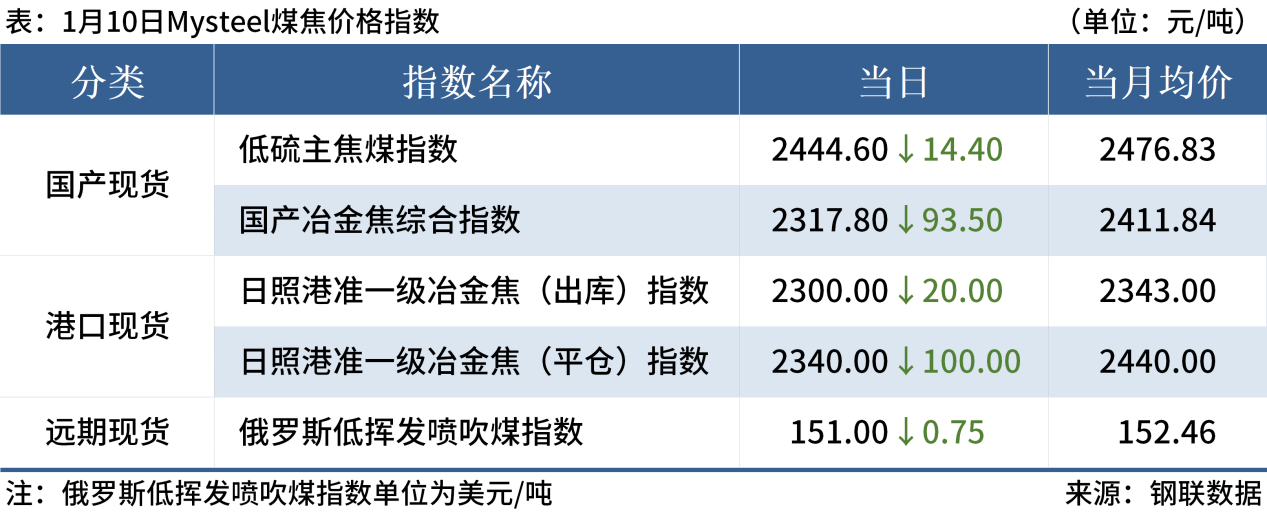 ◎ 1月10日國內(nèi)冶金焦市場偏弱運(yùn)行,河北、山東主流鋼廠再次下調(diào)焦炭采購價格,濕熄焦100元/噸,干熄焦110元/噸,至此焦炭二輪降價正式落地執(zhí)行。
