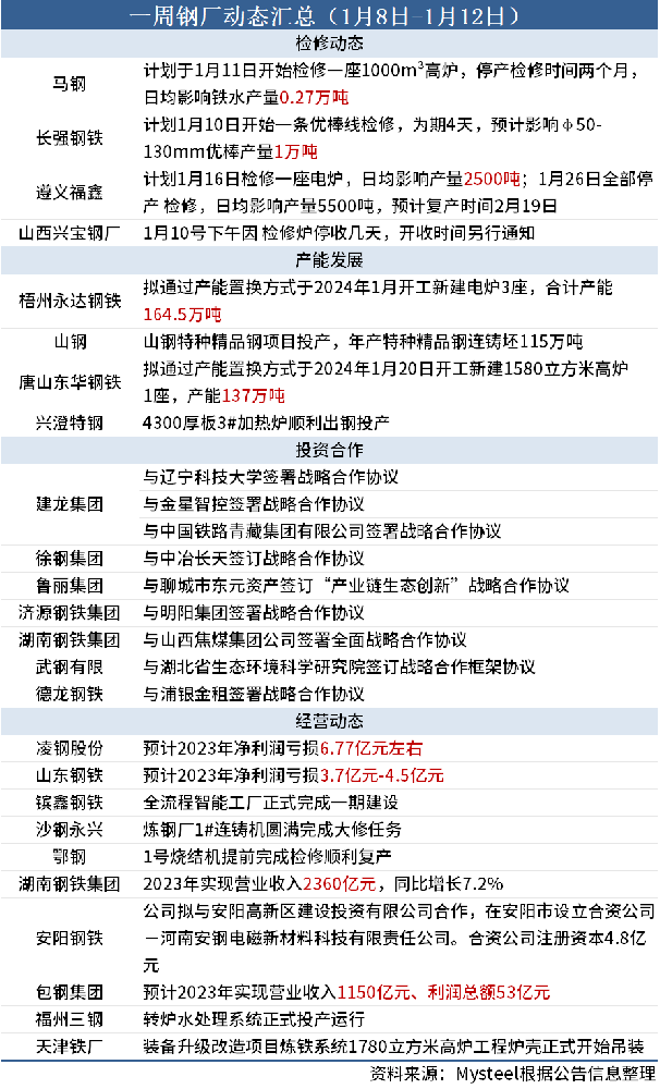 據(jù)Mysteel不完全統(tǒng)計,本周(1月8日-1月12日)有4家鋼廠檢修信息,具體如下:
