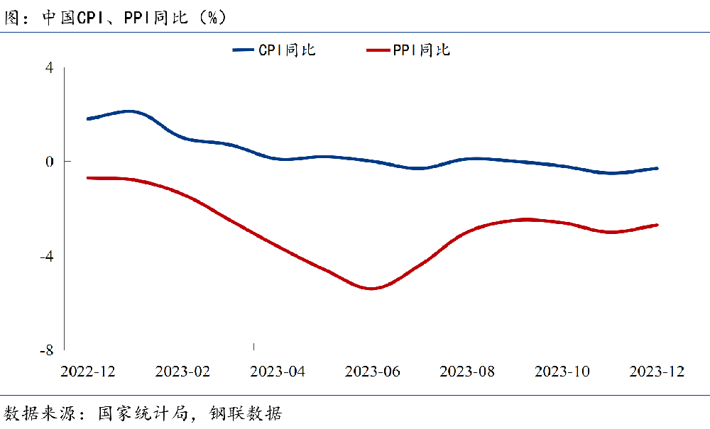 需求不足是2023年CPI同比處于明顯低位的主要原因。2023年PPI同比持續(xù)通縮,主要源于國際原油價格下跌向國內傳導,以及房地產投資下滑帶動國內主導的鋼鐵、煤炭、水泥等大宗商品價格出現較大幅度下跌。
