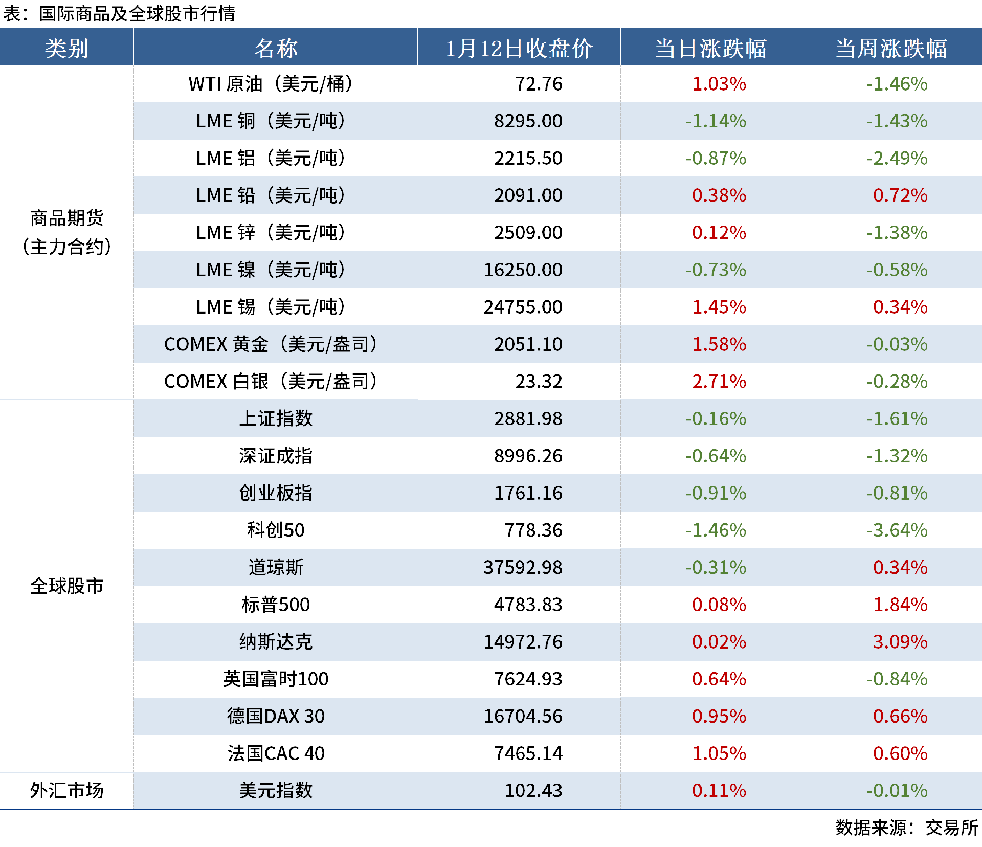 當周,商品期貨方面,主要商品期貨價格多數下跌。僅鉛、錫價格小幅上漲。全球股市方面,中國股市全部下跌,科創(chuàng)50跌幅最大,達3.64%;歐美股市大多上漲,其中,納斯達克漲幅最高,達3.09%。外匯市場方面,美元指數收于102.43,下跌0.01%。
