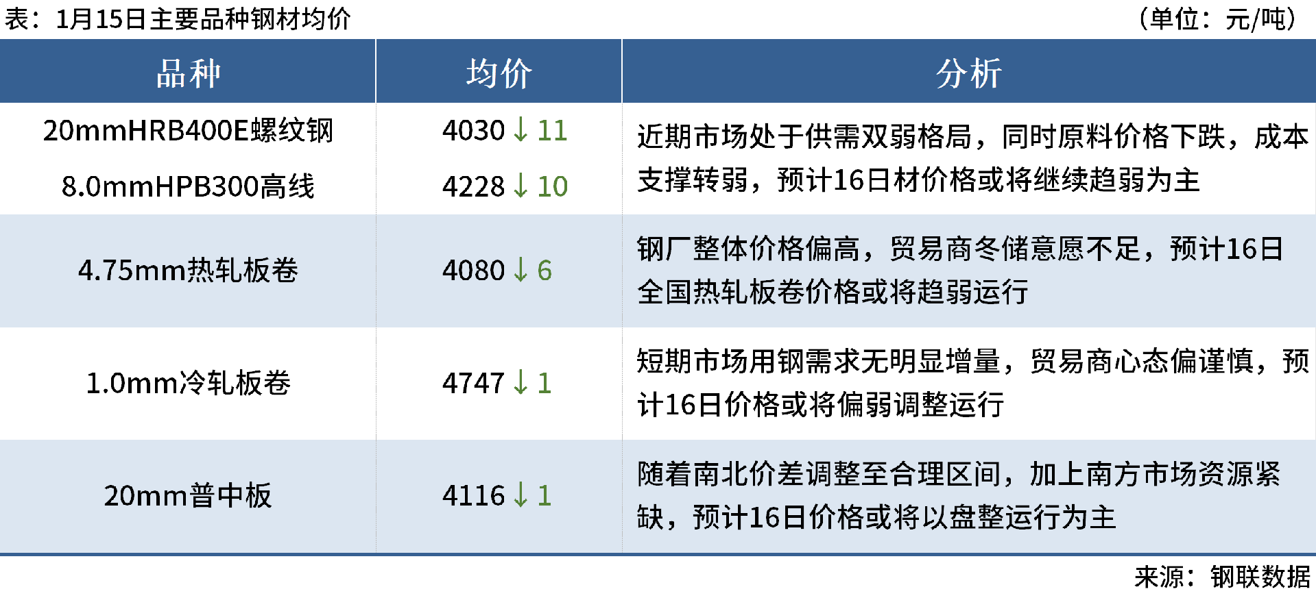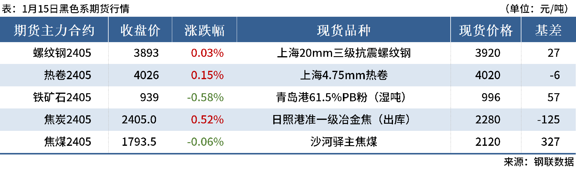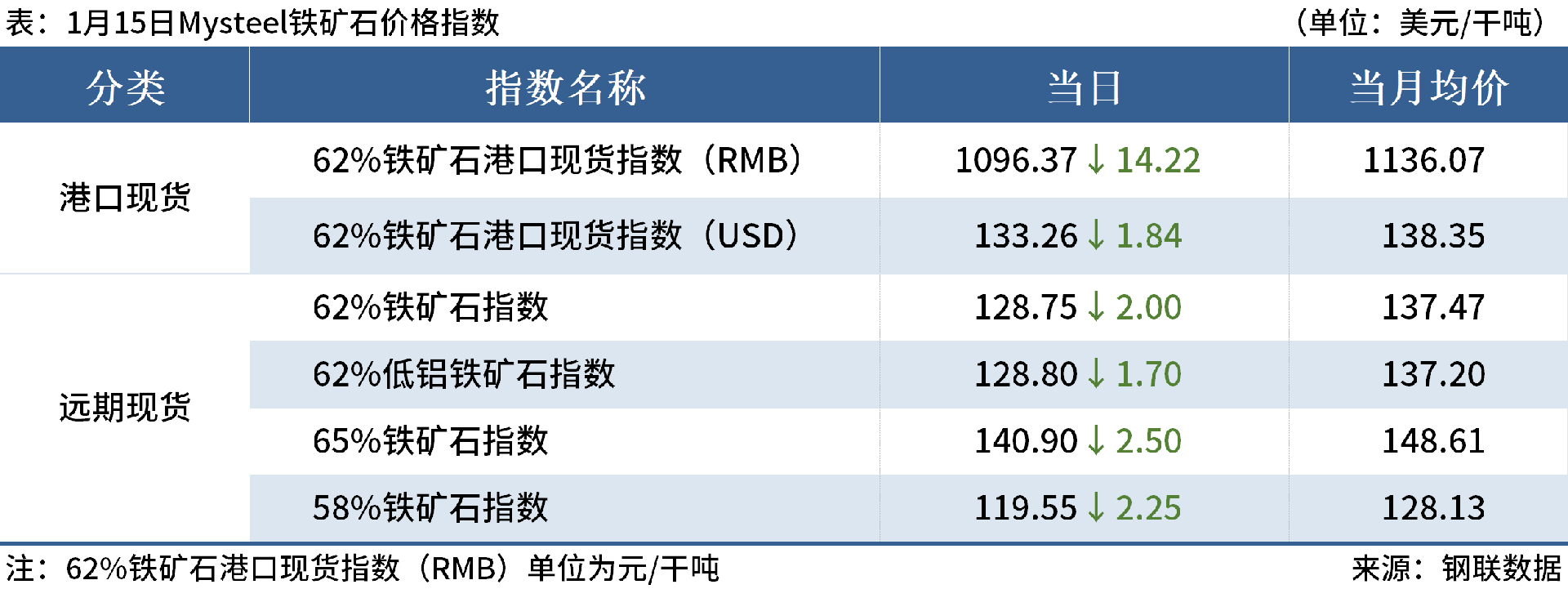◎1月15日,全國主港鐵礦石成交82.00萬噸,環(huán)比減28.7%;237家主流貿(mào)易商建筑鋼材成交13.08萬噸,環(huán)比增10%。