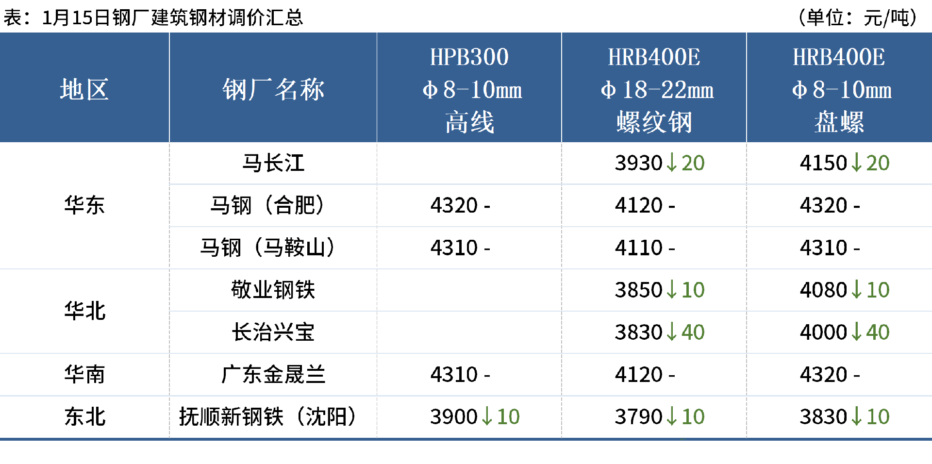 ◎1月15日,40家獨立電弧爐建筑鋼材鋼廠平均成本為4026元/噸,環(huán)比上周五下降3元/噸。平均利潤為2元/噸,谷電利潤為101元/噸,環(huán)比上周五下降5元/噸。