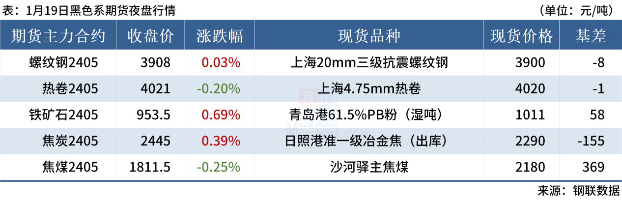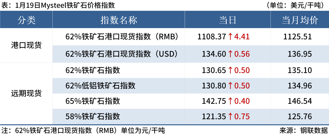 ◎ 1月19日,全國(guó)主港鐵礦石成交105.40萬(wàn)噸,環(huán)比減0.1%;237家主流貿(mào)易商建筑鋼材成交10.03萬(wàn)噸,環(huán)比減2.1%。
