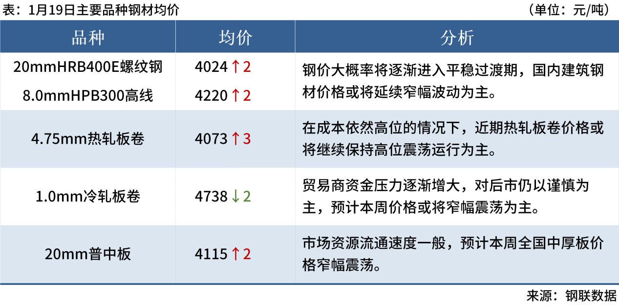 ◎ 1月21日沙鋼出臺(tái)1月下旬出廠價(jià),螺紋鋼下調(diào)50元/噸,盤(pán)線下跌50元/噸,現(xiàn)螺紋鋼4120元/噸、盤(pán)螺4260元/噸;1月20日中天鋼鐵出臺(tái)1月下旬出廠價(jià),螺紋上調(diào)50元/噸、線材盤(pán)螺上調(diào)50元/噸,現(xiàn)華東螺紋4100元/噸、線材盤(pán)螺4350元/噸。