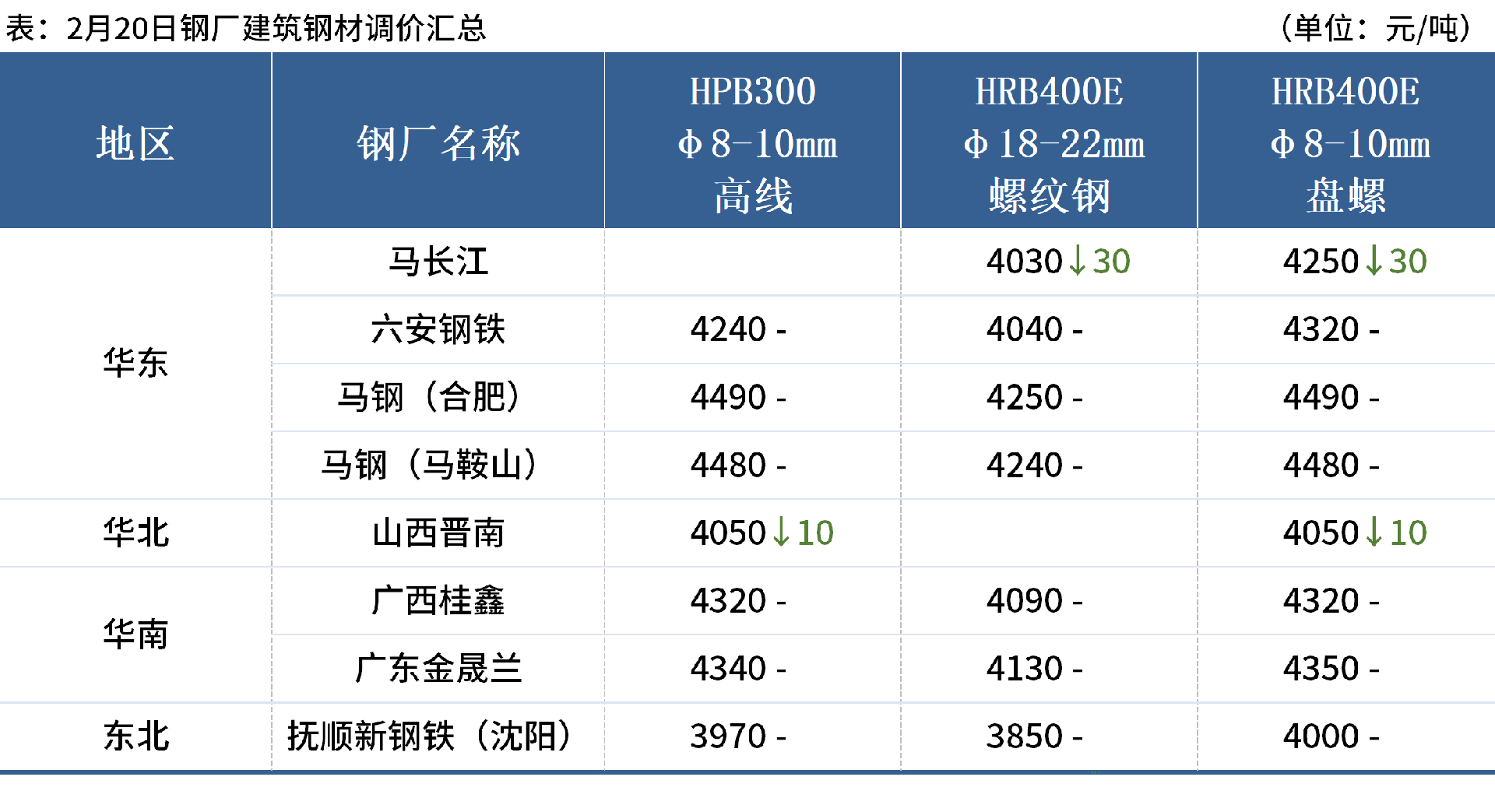 ◎2月20日中天鋼鐵出臺2月下旬出廠價,螺紋上調50、線材盤螺上調50,華東螺紋4150、線材盤螺4400。