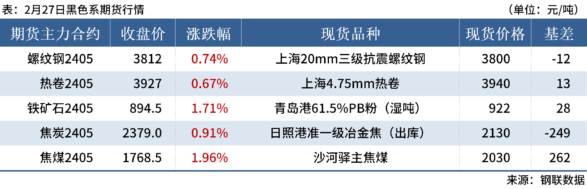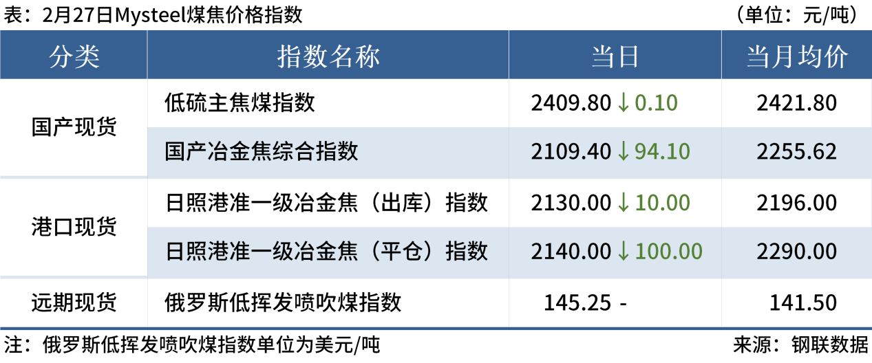 ◎ 河北、山東市場主流鋼廠對焦炭采購價下調(diào),濕熄降幅100元/噸,干熄降幅110元/噸,于2024年2月27日0時起執(zhí)行。至此,焦炭第四輪降價全面落地。