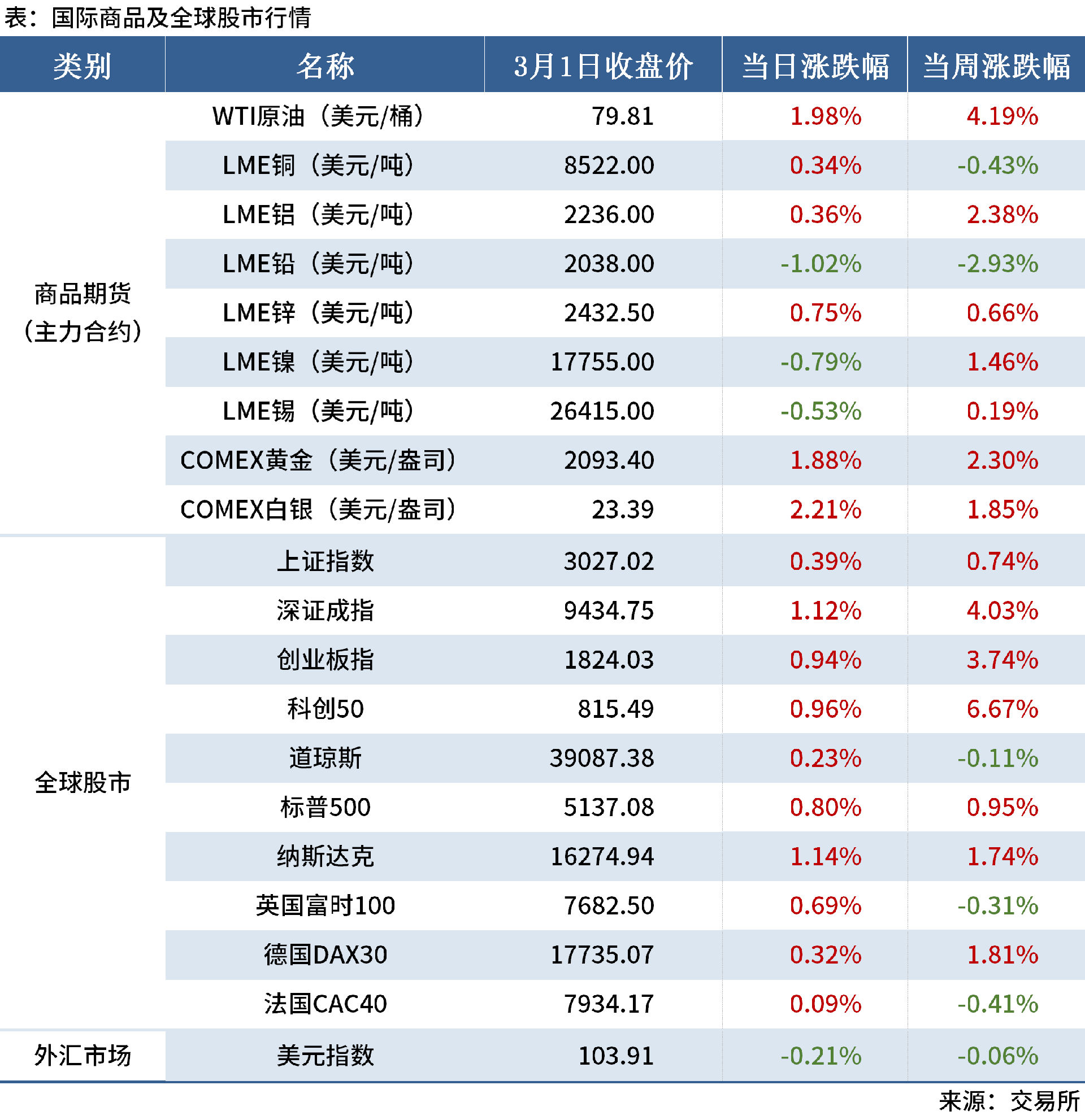 當(dāng)周,商品期貨方面,主要商品期貨價(jià)格多數(shù)上漲,其中,原油價(jià)格大幅上漲4.19%。全球股市方面,中國股市全部上漲,科創(chuàng)50漲幅最大,達(dá)6.67%;歐美股市漲跌互現(xiàn),其中,德國DAX30漲幅最高,為1.81%。外匯市場方面,美元指數(shù)收于103.91,下跌0.06%。
