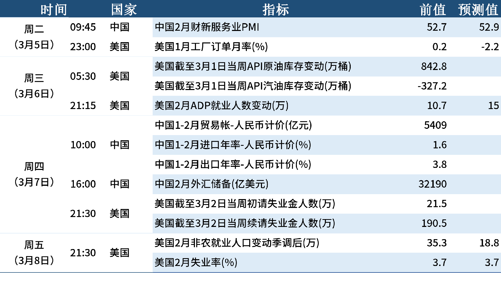◎ 2月中國制造業(yè)PMI較上月回落0.1個(gè)百分點(diǎn)至49.1%,連續(xù)5個(gè)月在榮枯線以下。2月中國非制造業(yè)商務(wù)活動(dòng)指數(shù)錄得51.4%,比上月回升0.7個(gè)百分點(diǎn)。分行業(yè)看,建筑業(yè)商務(wù)活動(dòng)指數(shù)為53.5%,比上月回落0.4個(gè)百分點(diǎn);服務(wù)業(yè)商務(wù)活動(dòng)指數(shù)為51.0%,比上月上升0.9個(gè)百分點(diǎn)。