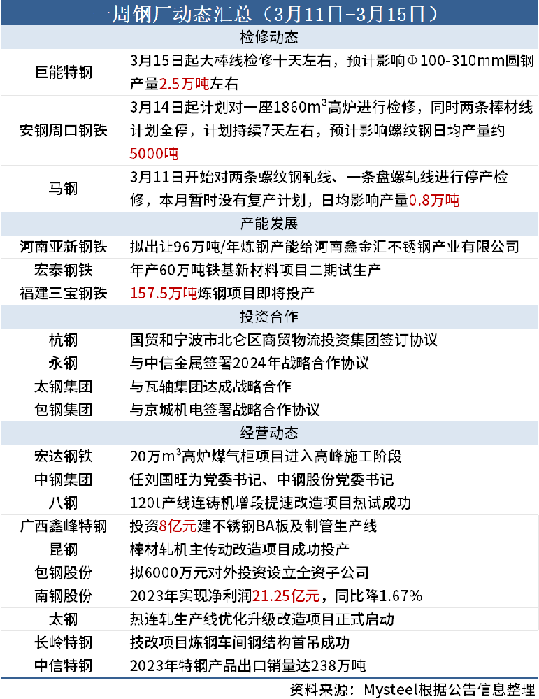 據(jù)Mysteel不完全統(tǒng)計(jì),本周(3月11日-3月15日)有3家鋼廠檢修信息,具體如下: