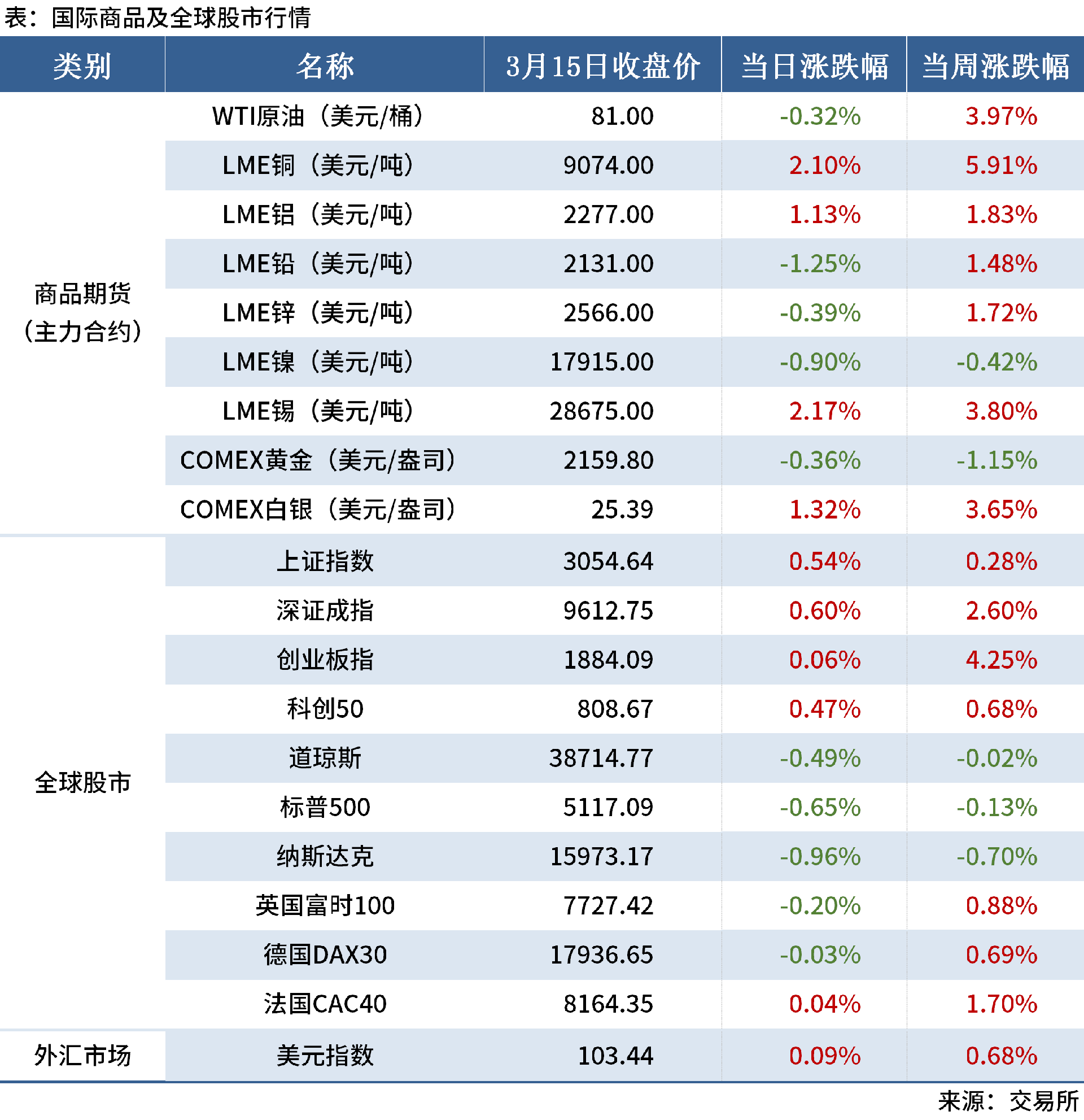 當(dāng)周,商品期貨方面,主要商品期貨價格多數(shù)上漲,LME銅價格大幅上漲5.91%。全球股市方面,中國股市全部上漲,創(chuàng)業(yè)板指漲幅最大,達4.25%;歐美股市漲跌互現(xiàn),其中,法國CAC40漲幅最高,上漲1.70%。外匯市場方面,美元指數(shù)收于103.44,上漲0.68%。