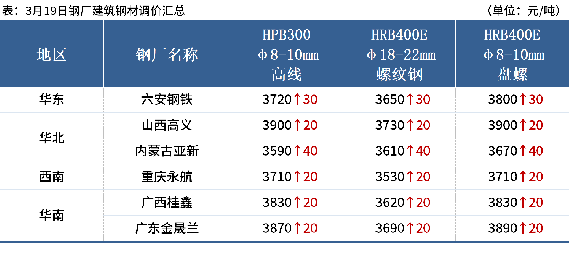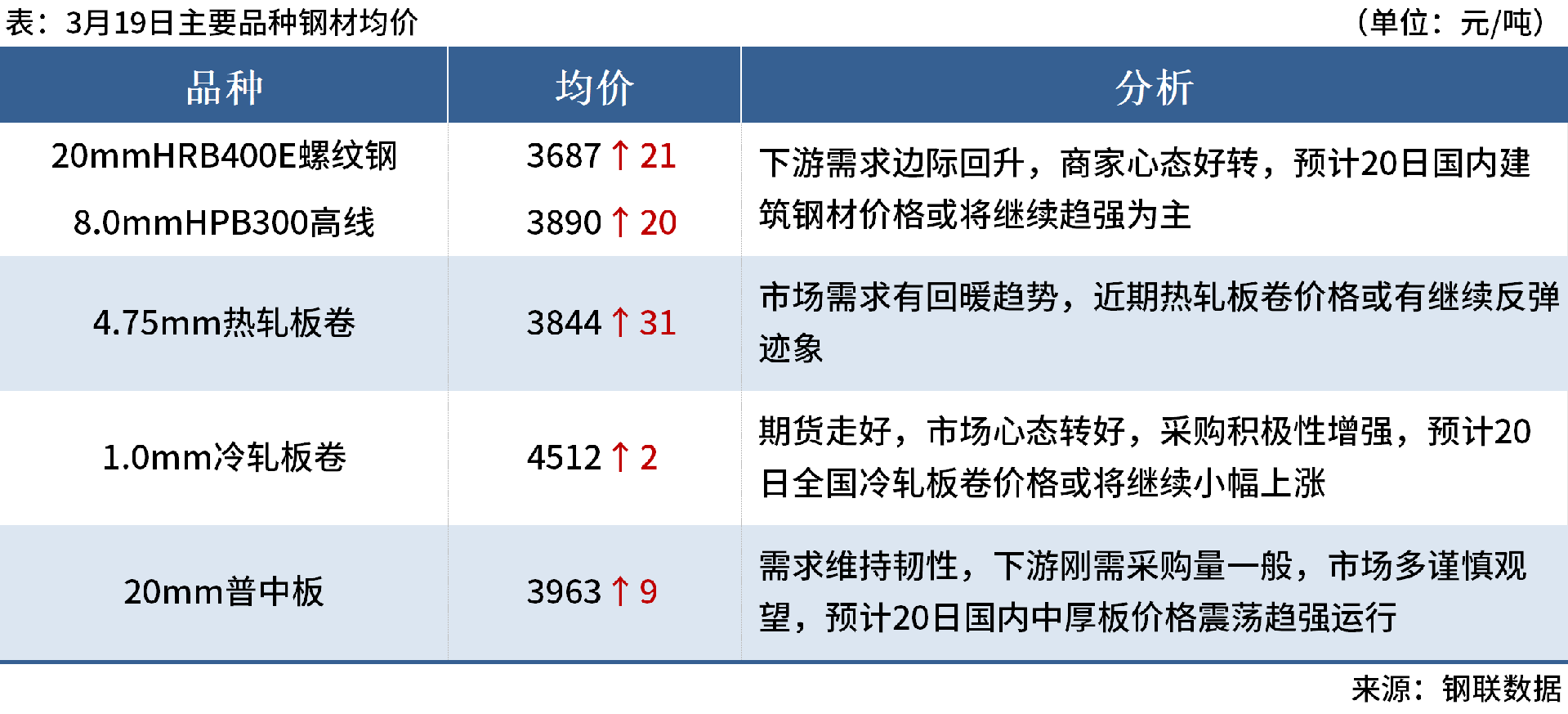 ◎3月19日,全國主港鐵礦石成交127.40萬噸,環(huán)比增20.2%;237家主流貿(mào)易商建筑鋼材成交18.75萬噸,環(huán)比增17.3%。