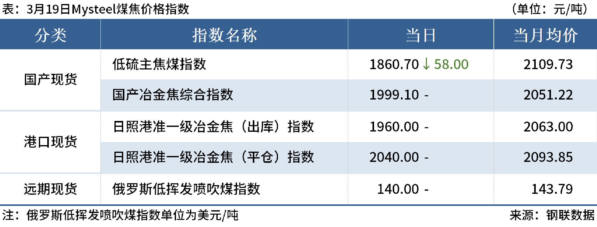 ◎3月19日,河北、天津部分鋼廠對焦炭采購價格提出第六輪降價,降幅100-110元/噸,主流焦鋼企業(yè)暫未回應(yīng)。