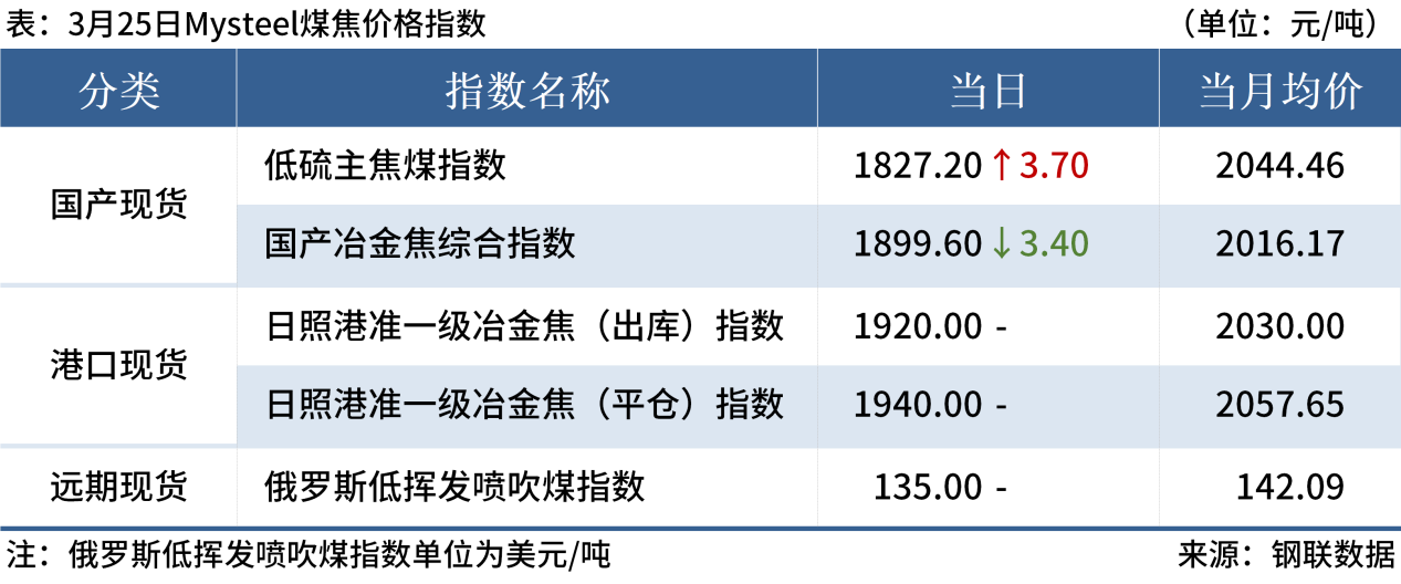 ◎ 截至3月25日,澳大利亞焦煤一線峰景CFR價(jià)格261.5美金/噸,較上周同期相比下跌27.5美金/噸,LV二線焦煤CFR價(jià)格222.5美金/噸,較上周同期相比下跌26.5美金/噸。詳情>>