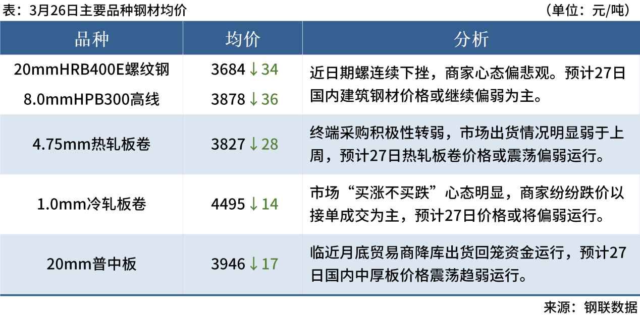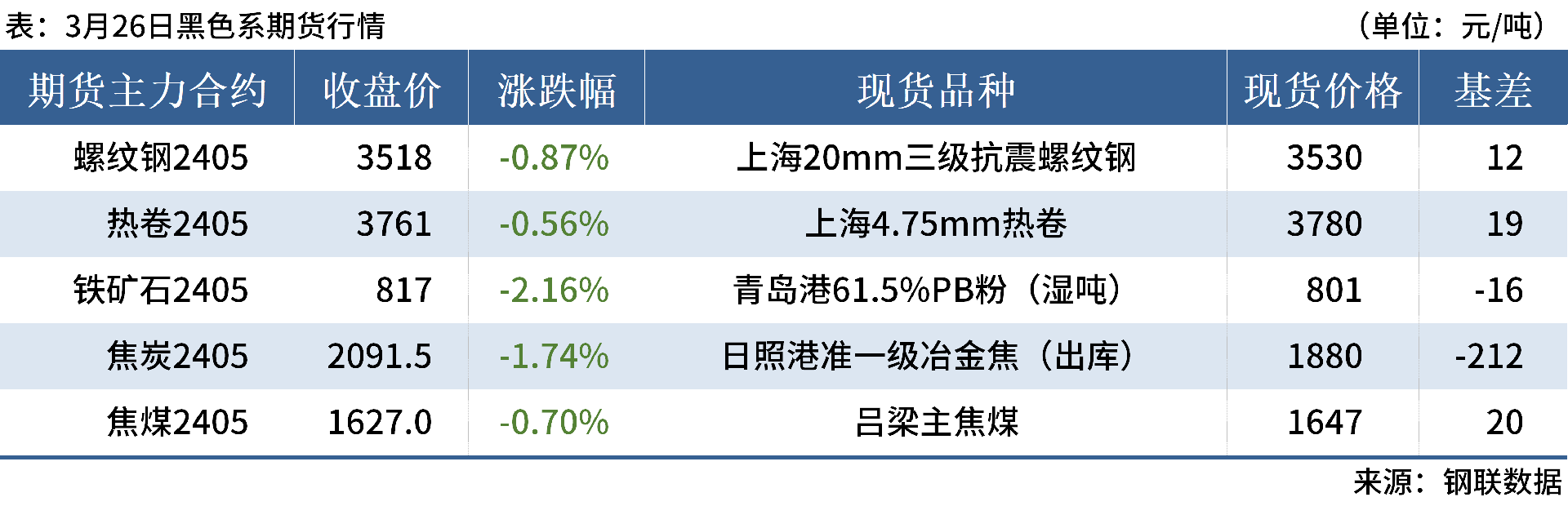 ◎ 3月26日,全國(guó)主港鐵礦石成交91.20萬(wàn)噸,環(huán)比減4.2%;237家主流貿(mào)易商建筑鋼材成交10.03萬(wàn)噸,環(huán)比減26.5%。