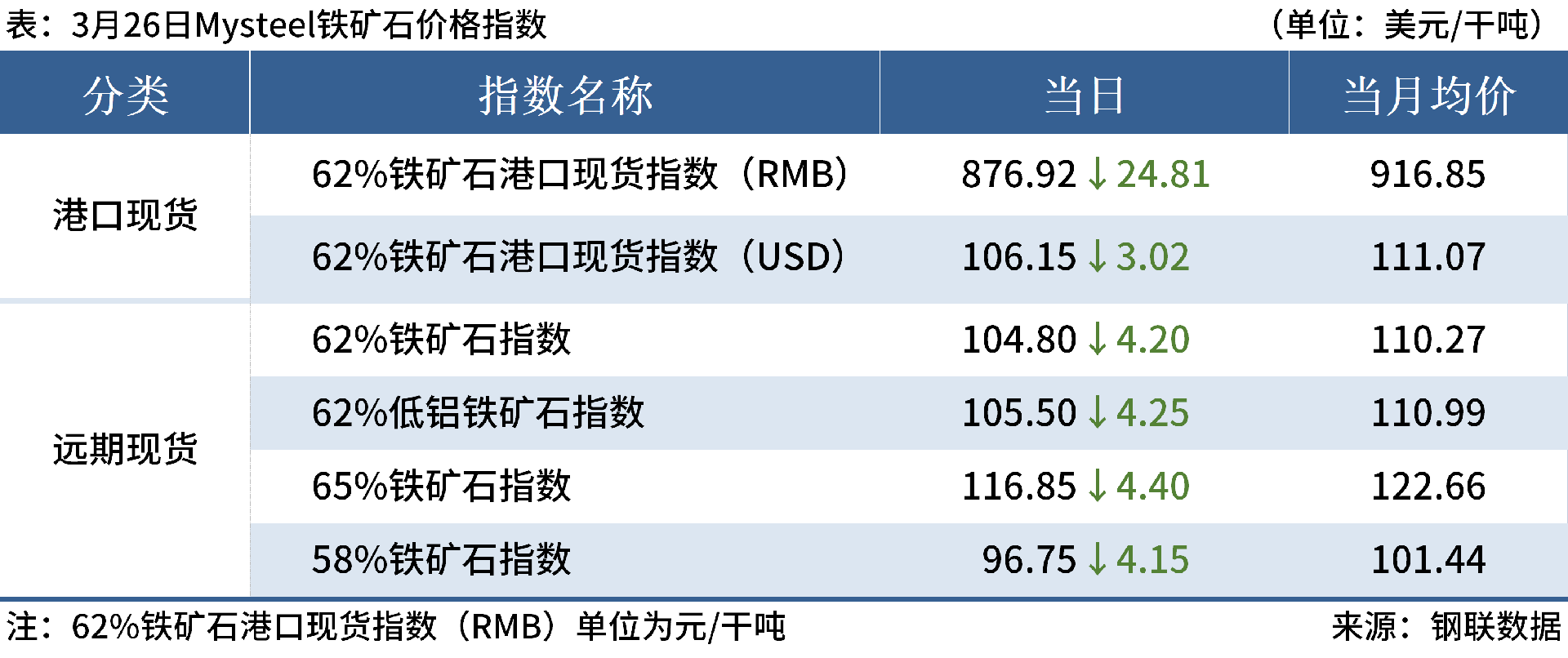 ◎ 3月26日,Mysteel 62%鐵礦石指數(shù)104.8,跌4.2,月均110.27;65%鐵礦石指數(shù)116.85,跌4.4,月均122.66。(單位:美元/干噸)