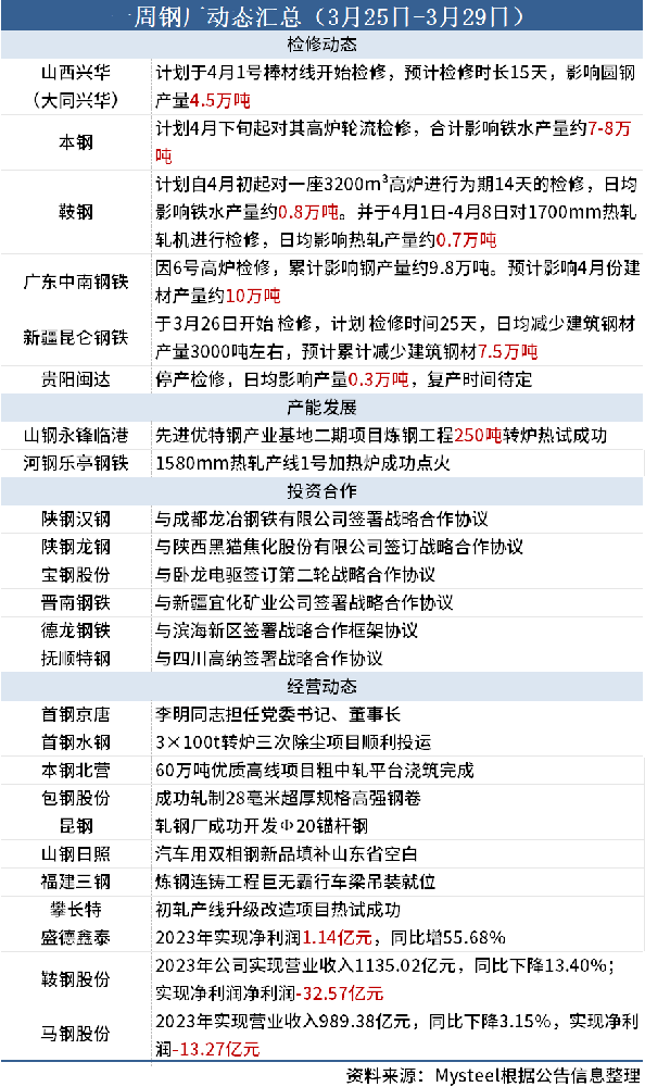 據(jù)Mysteel不完全統(tǒng)計(jì),本周(3月25日-3月29日)有6家鋼廠檢修信息,具體如下: