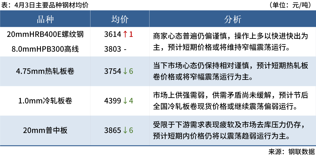 ◎ 4月3日,全國(guó)主港鐵礦石成交87.15萬(wàn)噸,環(huán)比減30.3%;237家主流貿(mào)易商建筑鋼材成交12.13萬(wàn)噸,環(huán)比減28.6%。