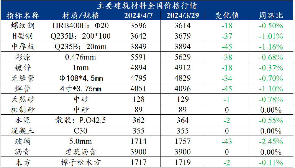核心觀點(diǎn):上周建材消費(fèi)環(huán)比下降1.89%,短期來看,宏觀面暫無利好政策,終端需求無明顯起色,近期為清明節(jié)假期后的工作日,疊加假日期間美聯(lián)儲降息預(yù)期后置,資金避險情緒增強(qiáng),整體成交一般。