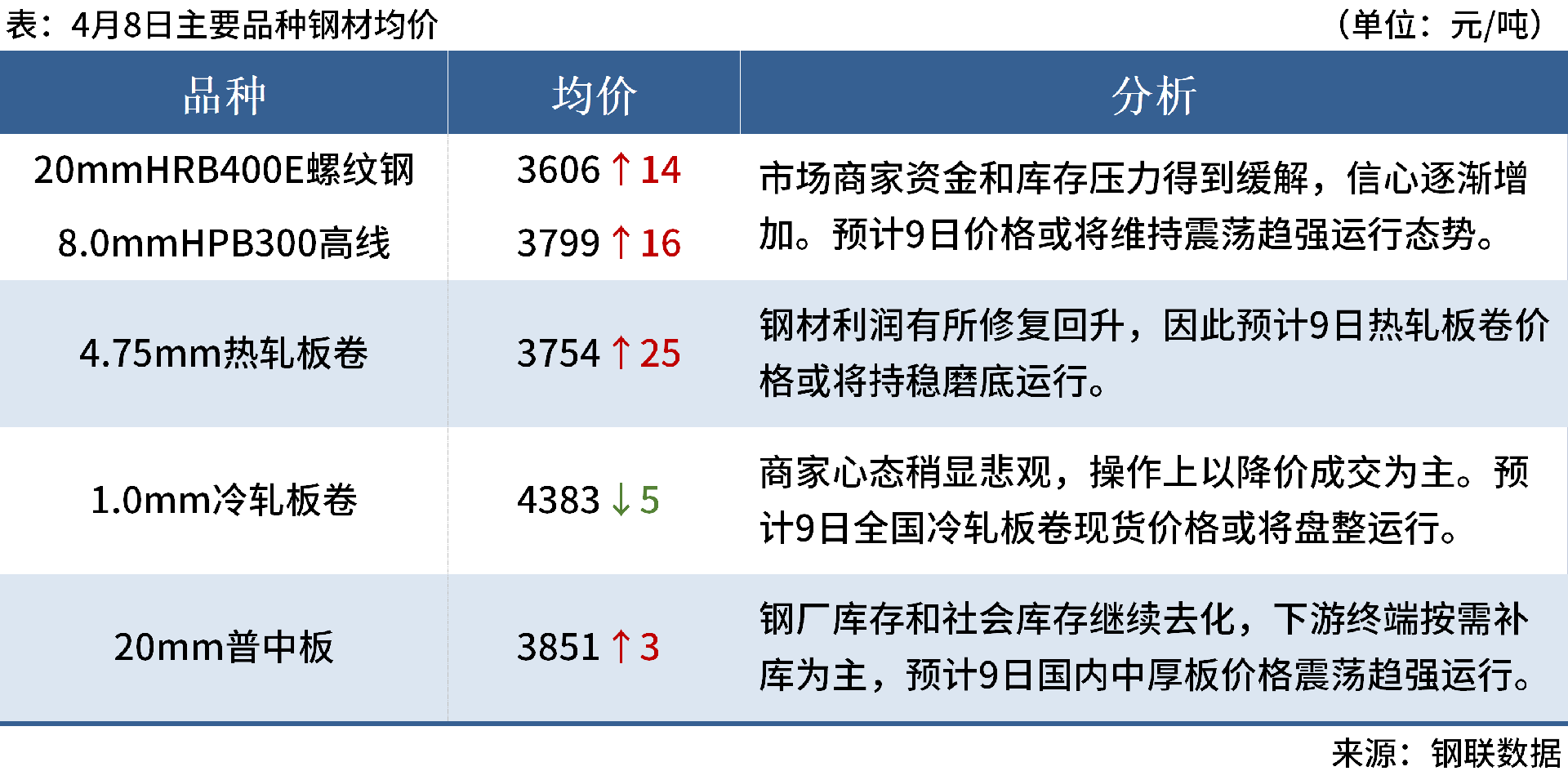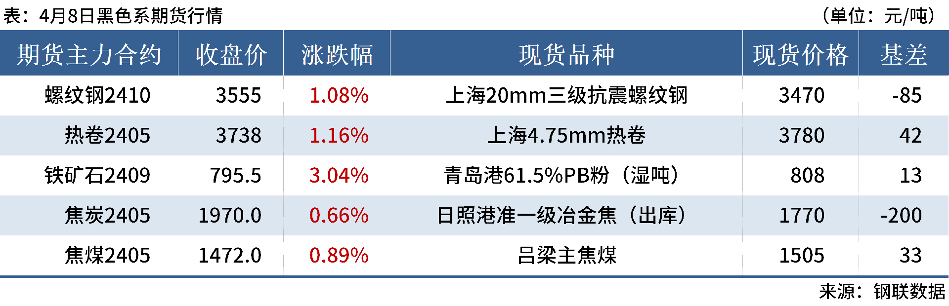 ◎ 4月8日,全國主港鐵礦石成交163.20萬噸,環(huán)比增435.1%;237家主流貿(mào)易商建筑鋼材成交19.96萬噸,環(huán)比增73.7%。