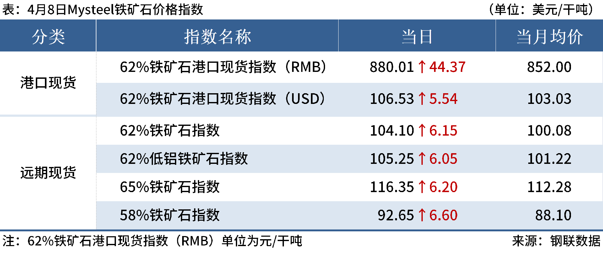 ◎ 4月8日,Mysteel 62%鐵礦石指數(shù)104.1漲6.15,月均100.08;65%鐵礦石指數(shù)116.35漲6.2,月均112.28。(單位:美元/干噸)