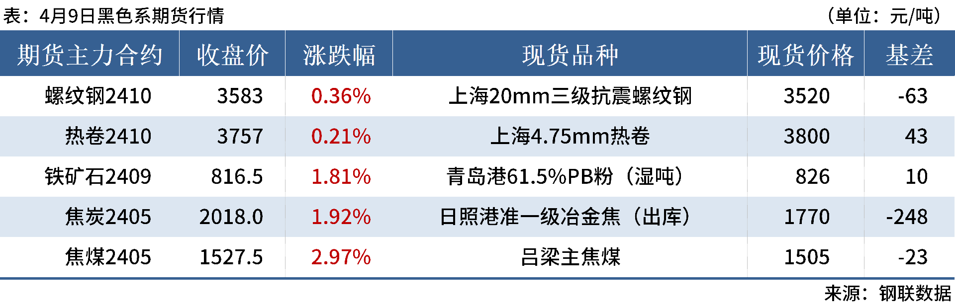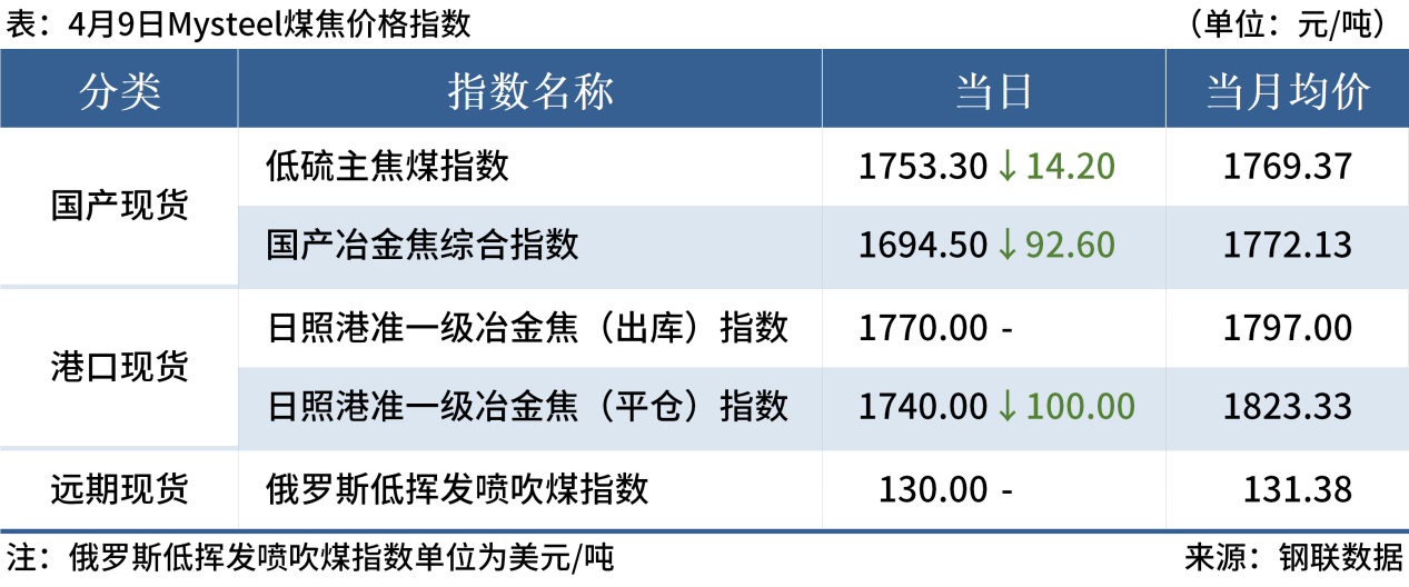 ◎ 4月9日,河北市場鋼廠對焦炭采購價下調,濕熄降幅100元/噸,干熄降幅110元/噸,第八輪焦炭提降基本落地。