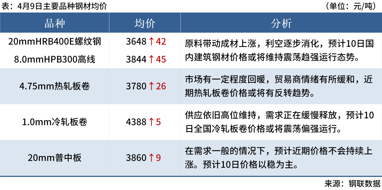 ◎ 4月9日,全國主港鐵礦石成交121.20萬噸,環(huán)比減25.7%;237家主流貿易商建筑鋼材成交17.51萬噸,環(huán)比減12.3%。