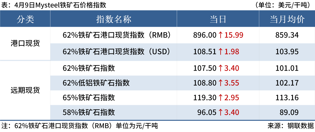 ◎ 4月9日,Mysteel62%鐵礦石指數(shù)107.5,漲3.4,月均101.01;65%鐵礦石指數(shù)119.3,漲2.95,月均113.16。(單位:美元/干噸)