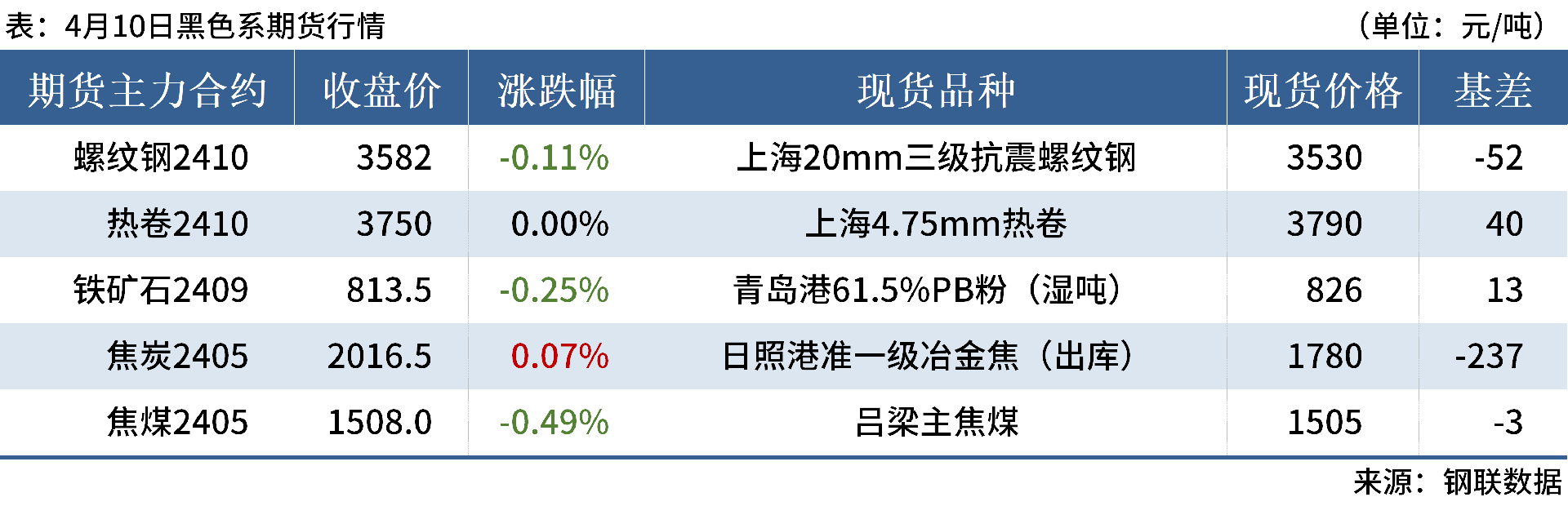 ◎ 4月10日,全國主港鐵礦石成交106.27萬噸,環(huán)比減12.3%;237家主流貿(mào)易商建筑鋼材成交12.85萬噸,環(huán)比減26.6%。