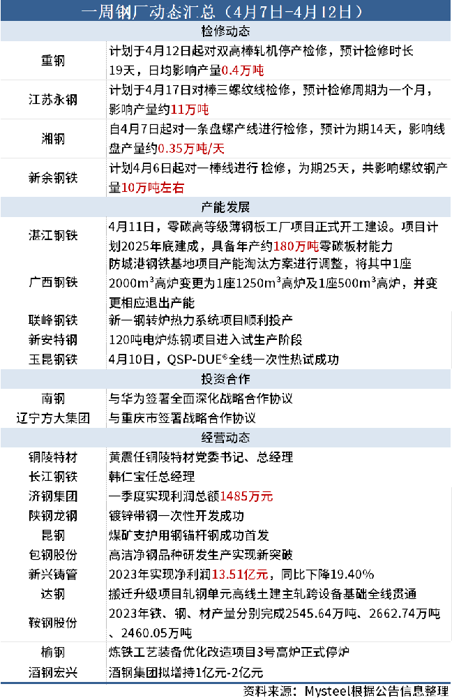 據(jù)Mysteel不完全統(tǒng)計(jì),本周(4月7日-4月12日)有4家鋼廠檢修信息,具體如下: