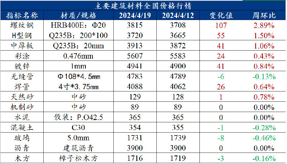 上周建材市場(chǎng)繼續(xù)上漲,全國螺紋鋼均價(jià)周環(huán)比上漲104元/噸。上周庫存去化加速,且政策利好刺激下,現(xiàn)貨市場(chǎng)量?jī)r(jià)齊升。