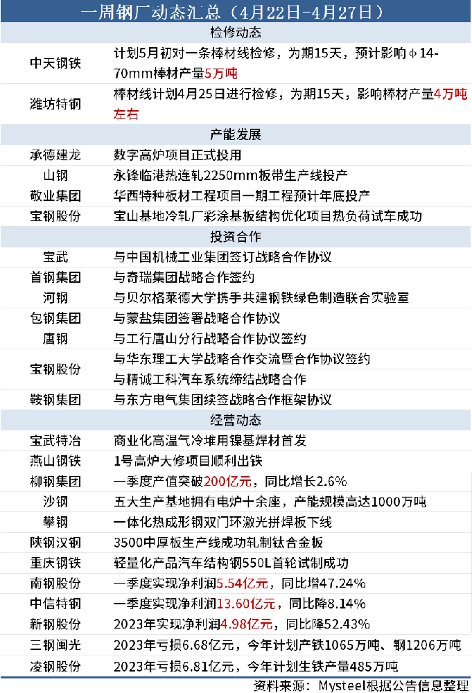 一周鋼廠動態(tài)匯總(4月22日-4月27日)