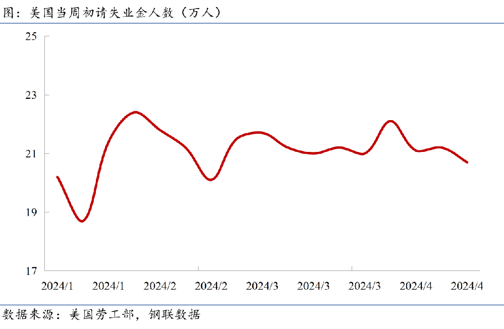 美國勞工部公布的數(shù)據(jù)顯示,截至4月20日當(dāng)周初請失業(yè)金人數(shù)為20.7萬人,為2024年2月17日當(dāng)周以來新低,前值為21.2萬。表明勞動(dòng)力市場狀況依然緊張。