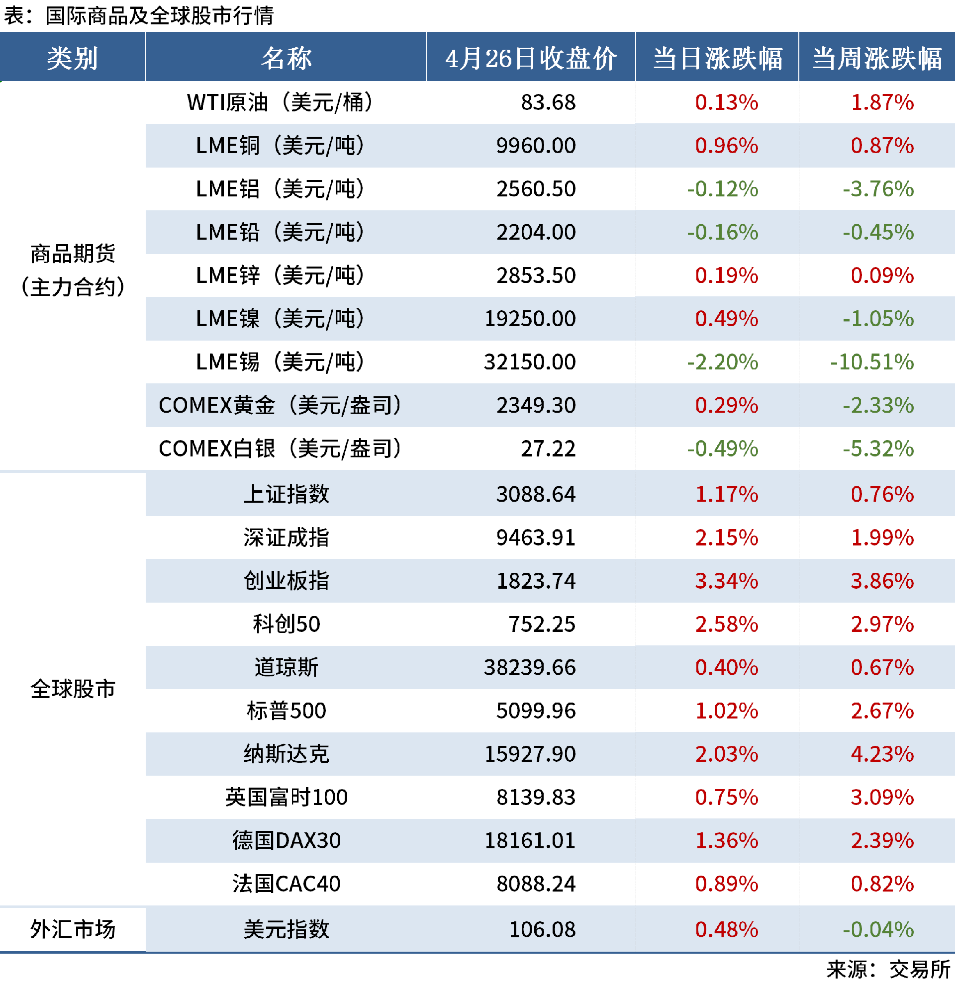 當(dāng)周,商品期貨方面,主要商品期貨價(jià)格漲跌互現(xiàn),錫價(jià)格大幅下跌10.51%。全球股市方面,中國股市全線上漲,科創(chuàng)板指漲幅最大,達(dá)3.86%;歐美股市全部上漲,其中,納斯達(dá)克漲幅最高,達(dá)4.23%。外匯市場方面,美元指數(shù)收于106.08,下跌0.04%。