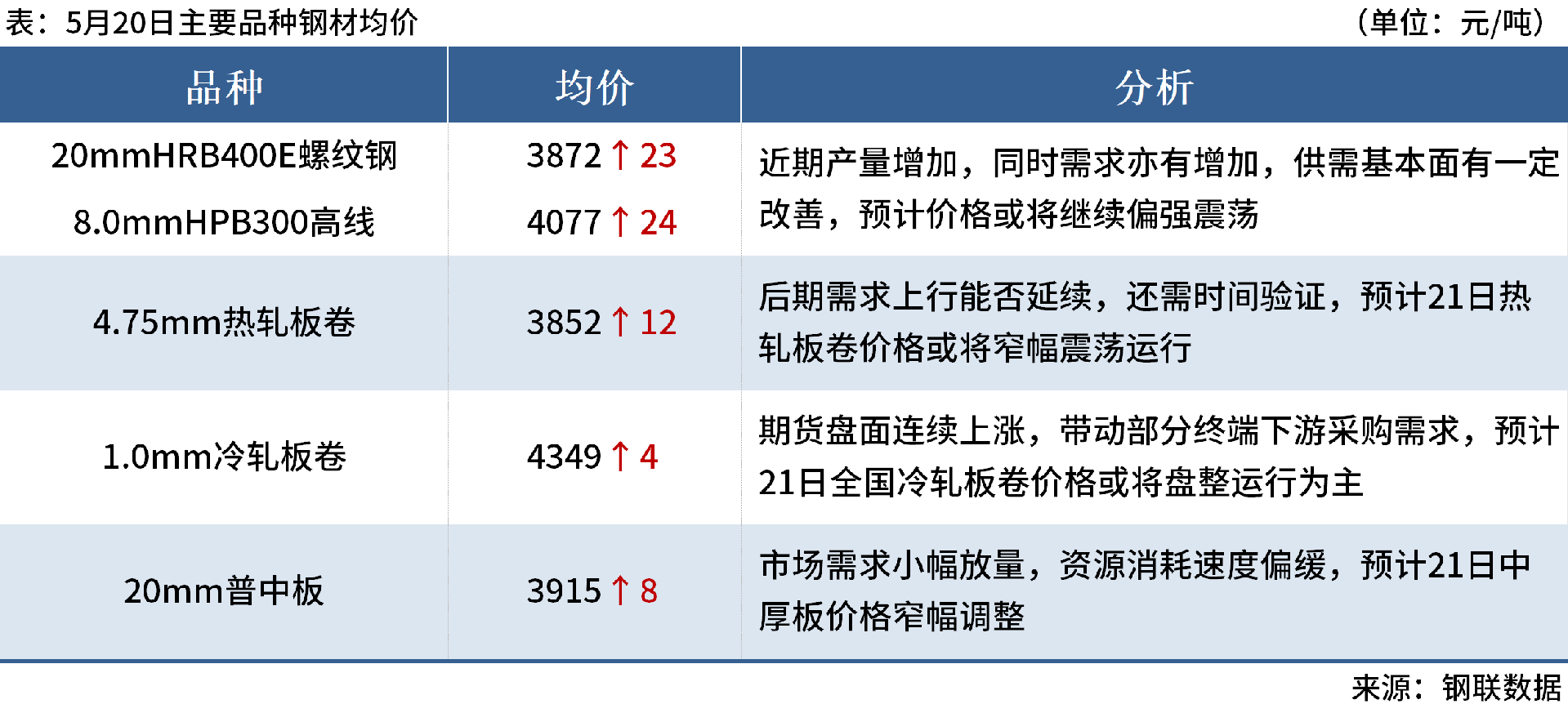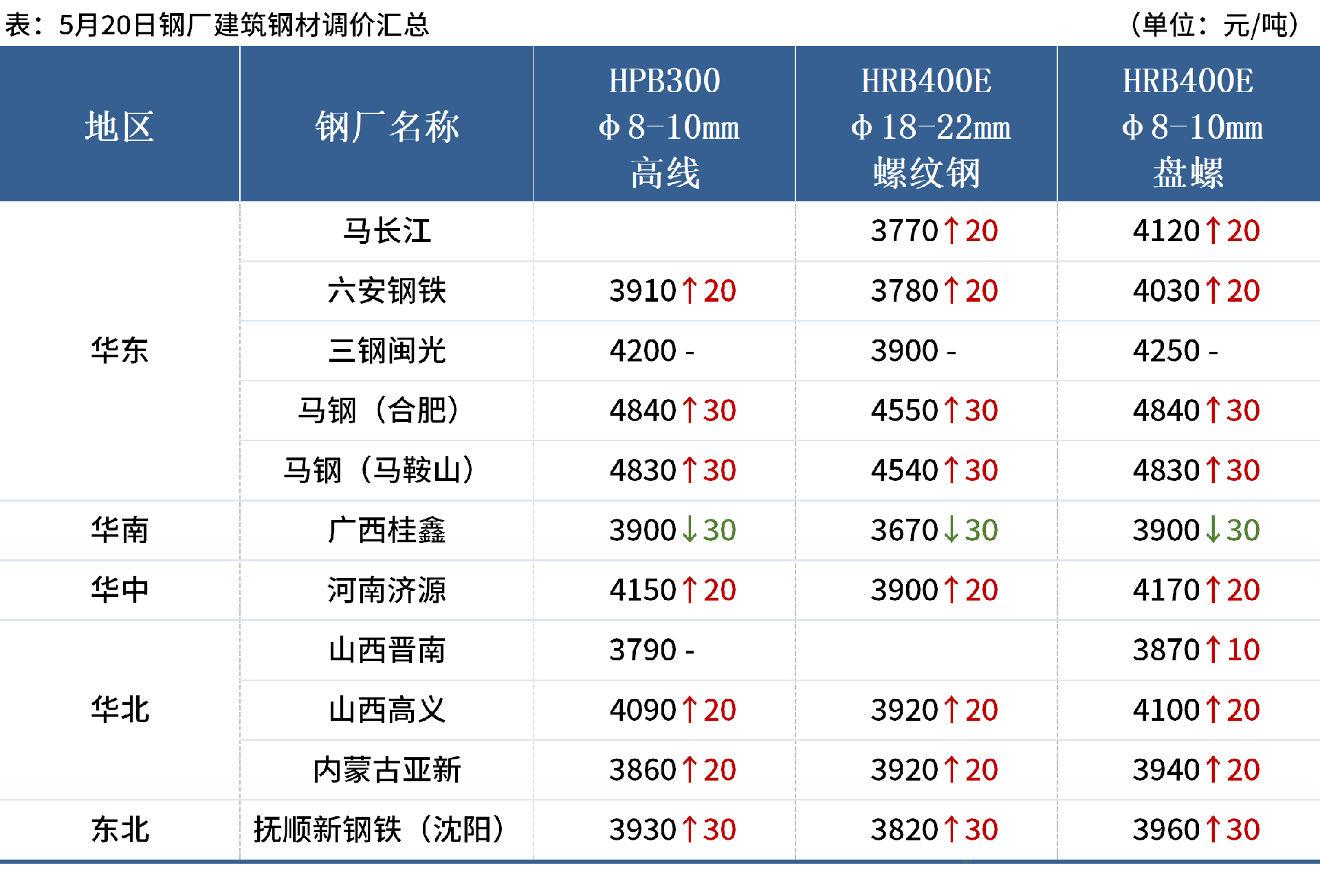 ◎5月20日中天鋼鐵出臺(tái)5月下旬出廠價(jià),螺紋鋼上調(diào)50元/噸、線(xiàn)材盤(pán)螺上調(diào)50元/噸,現(xiàn)華東螺紋鋼3800元/噸、線(xiàn)材盤(pán)螺4100元/噸。