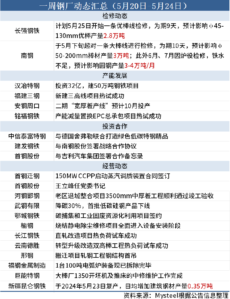 據(jù)Mysteel不完全統(tǒng)計(jì),本周(5月20日-5月24日)有2家鋼廠發(fā)布檢修信息,具體如下: