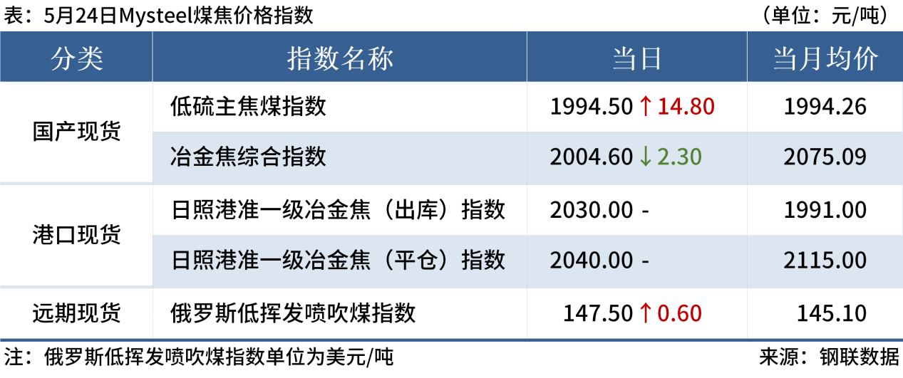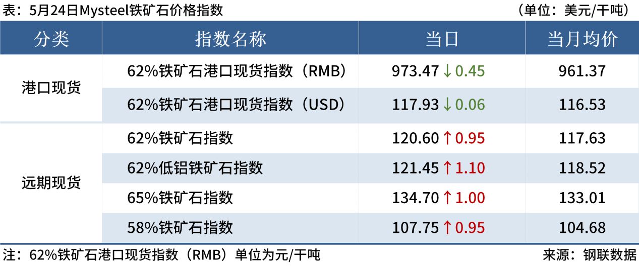 ◎ 5月24日,Mysteel62%鐵礦石指數(shù)120.6,漲0.95,月均117.63;65%鐵礦石指數(shù)134.7,漲1,月均133.01。(單位:美元/干噸)