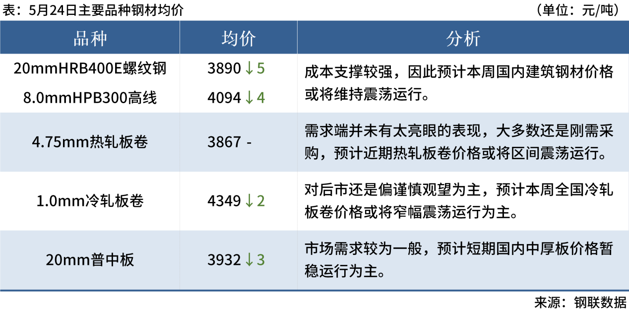 ◎ 5月24日,全國主港鐵礦石成交76.60萬噸,環(huán)比減9.1%;237家主流貿(mào)易商建筑鋼材成交14.09萬噸,環(huán)比增26.6%。