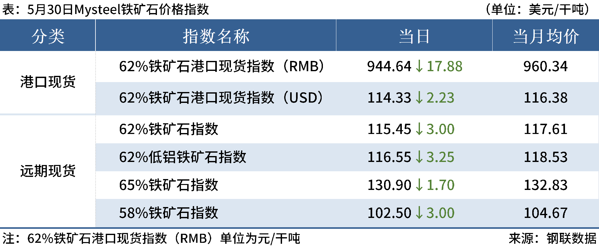 ◎ 5月30日,全國(guó)主港鐵礦石成交92.20萬(wàn)噸,環(huán)比增7.8%;237家主流貿(mào)易商建筑鋼材成交11.19萬(wàn)噸,環(huán)比減10.5%。