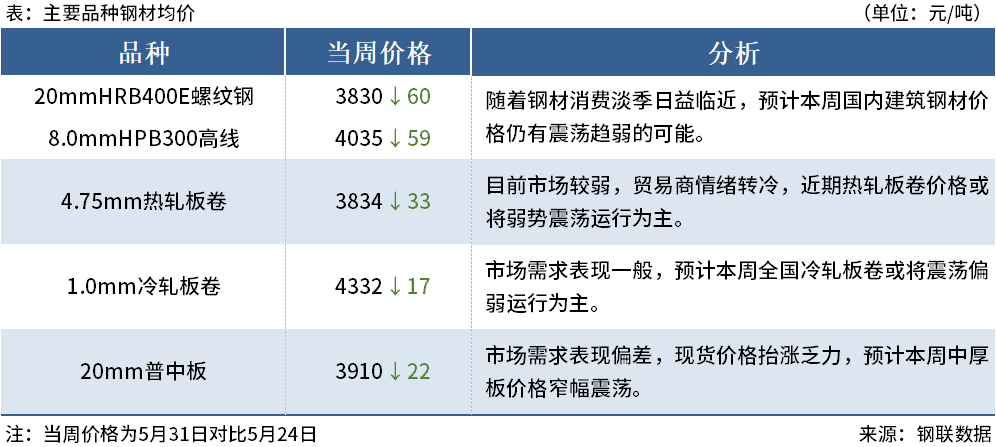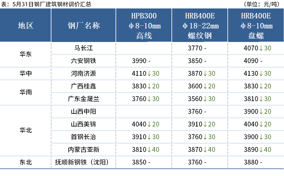◎5月31日,中天鋼鐵出臺6月上旬出廠價(jià),螺紋平、線材盤螺平,華東螺紋3800、線材盤螺4100。(單位:元/噸)