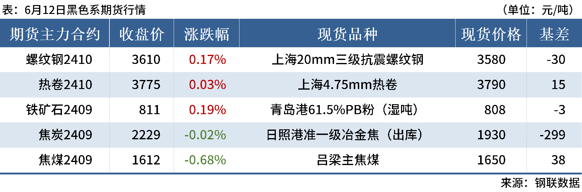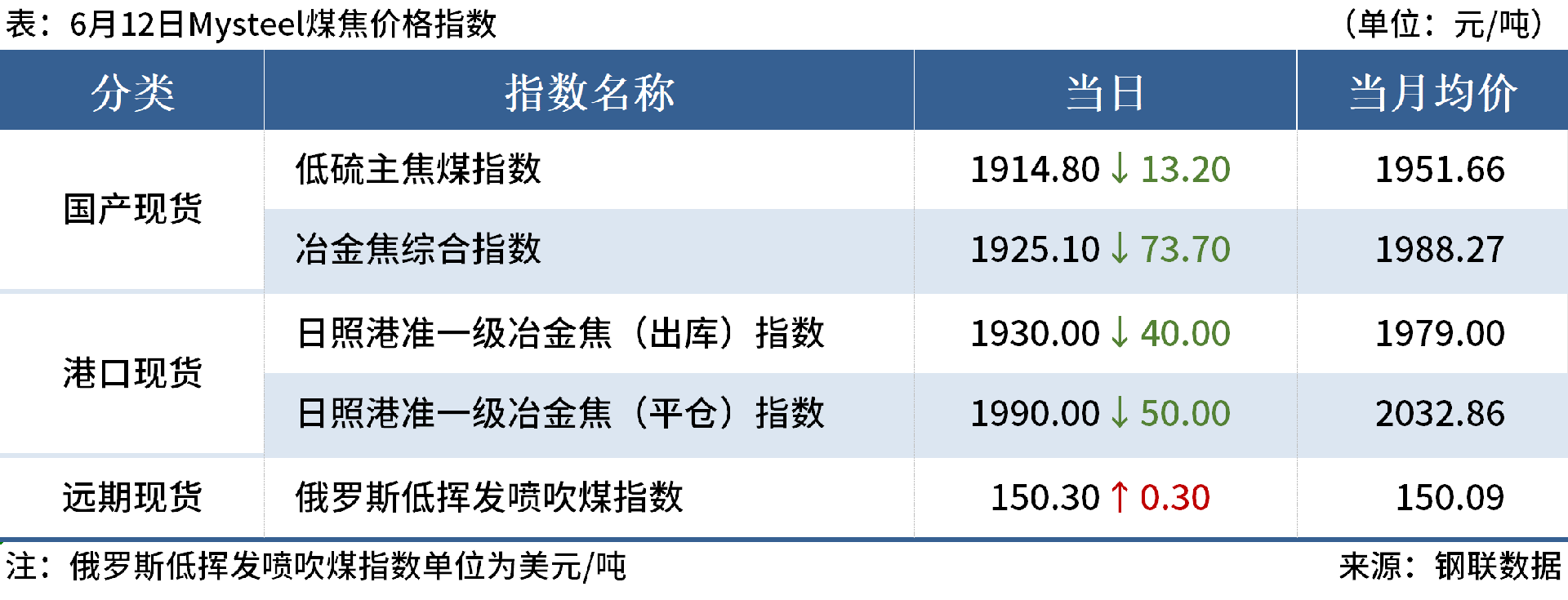 ◎6月12日,河北、山東主流鋼廠提降焦炭價格,濕熄焦50元/噸,干熄焦55元/噸,區(qū)域內(nèi)多數(shù)焦企落地執(zhí)行,但個別焦企認(rèn)為本次提降行為與當(dāng)前焦炭主流市場走勢存在較大偏差,拒絕接受降價,對提出降價的合作鋼企客戶,暫緩發(fā)貨。