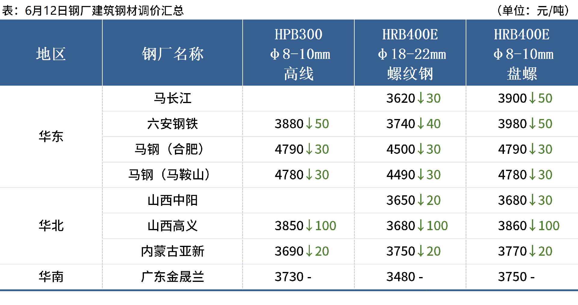 ◎6月12日,江蘇沙鋼廢鋼采購價格下調(diào)30元/噸,重三含稅2740元/噸,爐一含稅2820元/噸,年累計跌幅為270-320元/噸。
