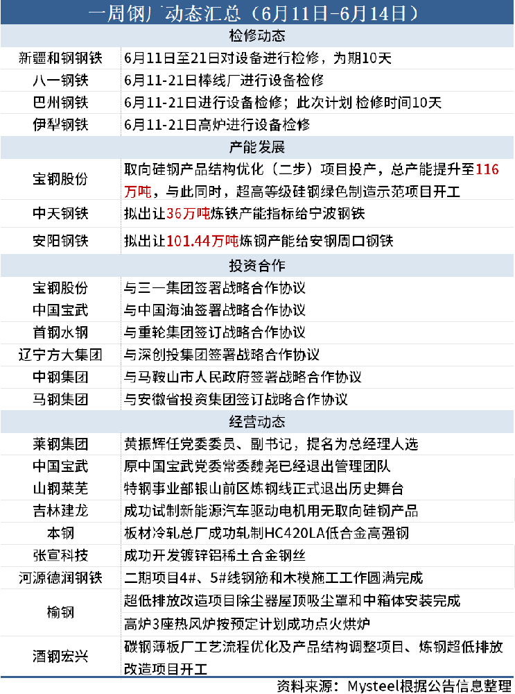 據(jù)Mysteel不完全統(tǒng)計,本周(6月11日-6月14日)有4家鋼廠發(fā)布檢修信息,具體如下: