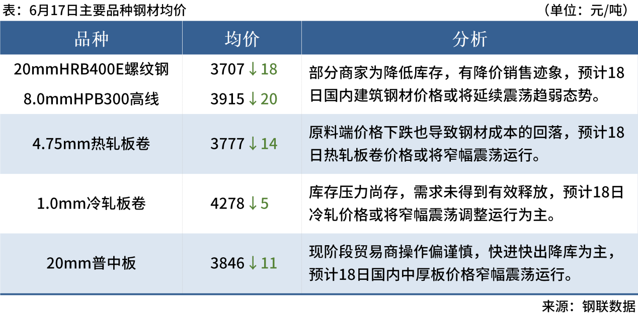 ◎ 6月17日,全國(guó)主港鐵礦石成交97.40萬(wàn)噸,環(huán)比增18.8%;237家主流貿(mào)易商建筑鋼材成交11.73萬(wàn)噸,環(huán)比減16.9%。