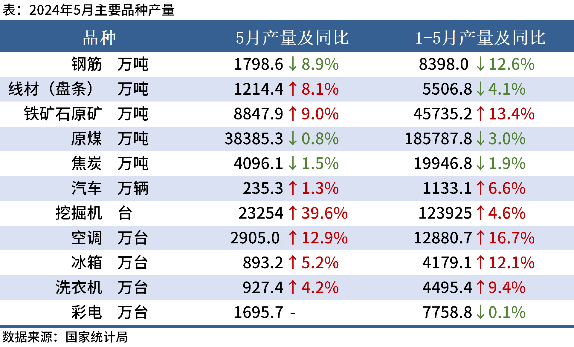 ◎ 國家統(tǒng)計局:2024年5月,中國鋼筋產(chǎn)量為1798.6萬噸,同比下降8.9%;1-5月累計產(chǎn)量為8398.0萬噸,同比下降12.6%。主要品種產(chǎn)量如下: