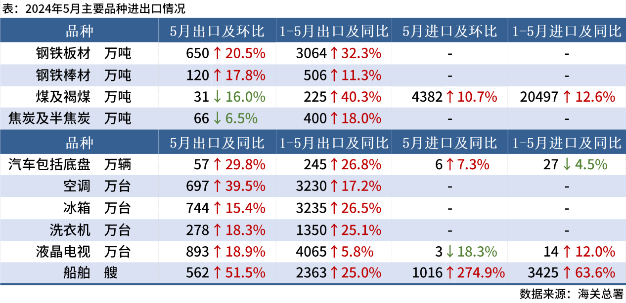 ◎ 海關(guān)總署:2024年5月,中國出口鋼鐵板材650萬噸,同比增長20.5%;1-5月累計出口3064萬噸,同比增長32.3%。5月,中國出口鋼鐵棒材120萬噸,同比增長17.8%;1-5月累計出口506萬噸,同比增長11.3%。其他出口情況如下: