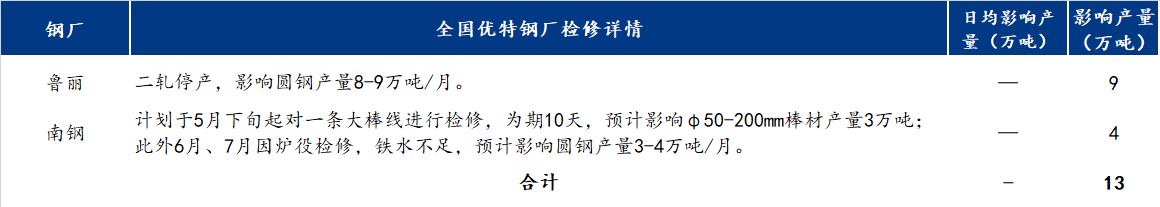 ◎上周,共有2家優(yōu)特鋼鋼廠發(fā)布檢修信息,檢修周期內(nèi)共計影響產(chǎn)量13萬噸。